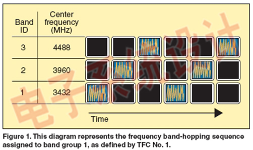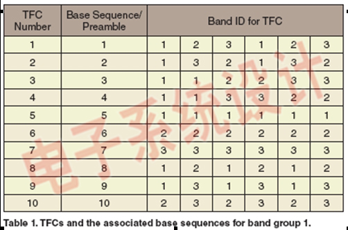 在每個頻帶組內(nèi)采用多達(dá)10種不同的TFC編碼來規(guī)定獨特的邏輯信道。 頻帶組1的TFC及有關(guān)基礎(chǔ)序列如表1所示。三個波段中波段跳頻的符號表示由TFC1確定,如圖1所示。