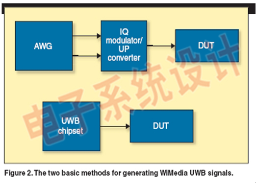 第一種方法如圖2中的上半部分所示。第一種方法提供了任意波形發(fā)生器的全部優(yōu)點,例如創(chuàng)建真實世界的信號,其中包括了失真和惡化,以及在RF中的跳頻(其是強制作為每個WiMedia 規(guī)范,并涉及使用昂貴而復(fù)雜的協(xié)議,例如外部跳頻器)。盡管第二種方法采用了專門的UWB芯片組來用于待測設(shè)備(DUT),如圖2的下半部分所示,其提供了頻帶跳躍信號功能,但并不提供AWG所具備的功能靈活性及RF靈敏性。因此,其用于開發(fā)生成基于WiMedia UWB波形的混合方法,并且該方法要具備第一種方法所具有的能力,而還要保留第二種方法的簡單性,這是非常理想的情況。具有這些特點的獨特方法的實現(xiàn)將在以下討論中加以論述。