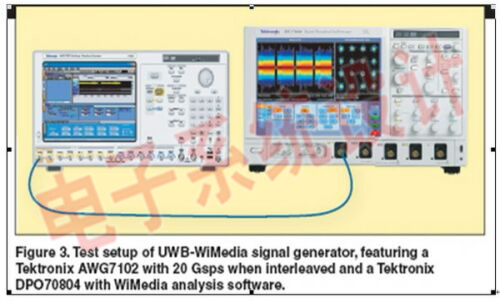 采用如圖3所示的測試裝置采集實驗數(shù)據(jù),其實現(xiàn)了直接RF合成結(jié)構(gòu)。采用泰克公司的AWG來生成全部WiMedia信號。AWG7000系列AWG具有極高的采樣速率、帶寬和信號保真度。例如,該設(shè)備具有由5Gsps至20Gsps(10位)的采樣速率,還具有一個或兩個輸出信道。該設(shè)備還可運行在打開的Windows (Windows XP)下,并能與外設(shè)連接,兼容第三方軟件。
