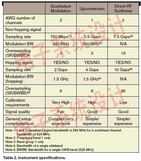 在載波頻率高達(dá)10 GHz下,合成帶寬超過1.5GHz的信號,這超過了無線通訊測試中所使用的傳統(tǒng)矢量信號產(chǎn)生結(jié)構(gòu)的能力。對于必要的調(diào)制和基帶帶寬,UWB- WiMedia信號的跳頻特性以及信號I和Q成分的任意幅度、時間和頻率響應(yīng)失調(diào)的影響,需要更多的努力來達(dá)到UWB-WiMedia信號所要求的信號質(zhì)量。除下列對產(chǎn)生UWB信號的潛在結(jié)構(gòu)的說明外,表2列出了不同配置所要求的AWG的更多細(xì)節(jié)。