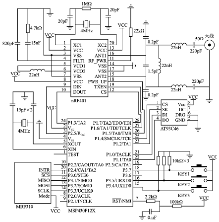 AT93C46中保存有256位的參數(shù)配置數(shù)據(jù),用于對(duì)發(fā)射的數(shù)據(jù)進(jìn)行加密運(yùn)算;nRF401工作在無(wú)線發(fā)射模式。MBF310選用SPI工作模式和 MSP430F12X處理器的SPI總線相連,MSP430F12X通過(guò)SPI總線對(duì)MBF310傳感器進(jìn)行工作狀態(tài)初始化,配置為使能FIFO中斷的 SPI模式。當(dāng)手指在MBF310上滑過(guò)時(shí),MBF310采集指紋數(shù)據(jù)并存到FIFO緩沖區(qū)內(nèi);當(dāng)FIFO緩沖區(qū)滿時(shí)產(chǎn)生一中斷信號(hào), MSP430F12X處理器收到FIFO緩沖區(qū)滿中斷信號(hào)后立即通過(guò)SPI總線讀取MBF310采集的指紋數(shù)據(jù);并把讀取的指紋數(shù)據(jù)和AT93C46內(nèi)的配置字進(jìn)行“或”運(yùn)算加密,把加密好的數(shù)據(jù)通過(guò)nRF401發(fā)射出去,從而實(shí)現(xiàn)指紋的采集,指紋數(shù)據(jù)的讀取、加密和無(wú)線發(fā)射,以及控制指令的無(wú)線發(fā)射等功能。防盜遙控發(fā)射器的電路連接圖如圖1所示。