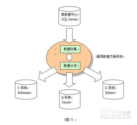 首先,該數(shù)據(jù)交換要能同時(shí)支持多個(gè)系統(tǒng)之間的數(shù)據(jù)進(jìn)行交換(或稱之為同步),它必須要有一套完整的數(shù)據(jù)收集及數(shù)據(jù)分發(fā)系統(tǒng),我們暫時(shí)稱其為“通用數(shù)據(jù)交換系統(tǒng)”,如圖7所示。