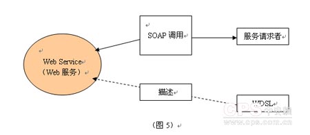 簡(jiǎn)單的說,一個(gè)Web服務(wù)(圖5)就是一個(gè)能夠使用XML消息通過網(wǎng)絡(luò)來訪問的接口,這個(gè)接口描述了一組可訪問的操作。它是由企業(yè)驅(qū)動(dòng)和應(yīng)用驅(qū)動(dòng)而產(chǎn)生的;它具有分布性、松散藕合、可復(fù)用性、開放性以及可交互性等特性。