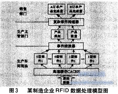 從該制造企業(yè)整個(gè)過程可以看到,RFID原始數(shù)據(jù)通過高速緩存CACHE、事件濾波器、復(fù)雜事件構(gòu)建器過程,其基本事件數(shù)量大大減少,而且可充分挖掘了RFID數(shù)據(jù)中的有用信息,使各個(gè)部門易于獲得所需的數(shù)據(jù)。