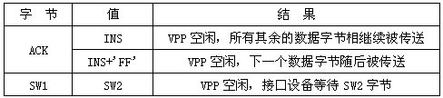 終端傳輸層根據(jù)卡片返回的過程字符和狀態(tài)字節(jié)執(zhí)行相應(yīng)的操作,使讀寫器對數(shù)據(jù)的處理過程明朗清晰。卡片返回的過程字節(jié)和狀態(tài)字節(jié)跟應(yīng)用層發(fā)送給卡的 APDU(Application Protocol Data Unit,應(yīng)用協(xié)議數(shù)據(jù)單元)和VPP使用等有關(guān)。表2.1為VPP未用時(shí)的終端傳輸層中返回的過程字節(jié)。