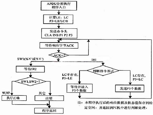 根據(jù)目前CPU卡的常用T=0協(xié)議、自帶編程升壓電路的應(yīng)用情況,以及本讀寫器接收IC卡數(shù)據(jù)報(bào)文直接發(fā)送PC機(jī)處理的特點(diǎn),本讀寫器可行的APDU命令和響應(yīng)的處理流程如圖2.3所示。