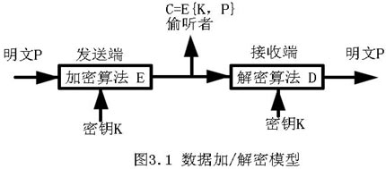 一般保密通道如圖3.1所示,在發(fā)送端,把明文P用加密算法E和密鑰K加密,變成秘文C,在接收端采用相反解密算法D使用密鑰K,將秘文C解密得到明文P。完成數(shù)據(jù)安全傳輸。即P = D{K,C}。