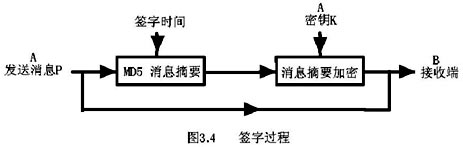 首先A將消息P與簽字時(shí)間拼接,形成新用于驗(yàn)證發(fā)送消息的信息,在經(jīng)過MD5雜湊算法計(jì)算出消息摘要,成為用于驗(yàn)證消息時(shí)的消息指紋。同時(shí)A使用自己的密鑰K對該消息進(jìn)行加密后連同原P消息一同發(fā)送給B。完成對消息簽字的過程。