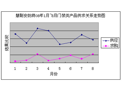 慧聰安防網(wǎng)08年1月~8月門禁類產(chǎn)品供求關(guān)系走勢(shì)圖