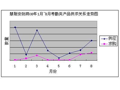慧聰安防網(wǎng)08年1月~8月考勤類產(chǎn)品供求關(guān)系走勢(shì)圖