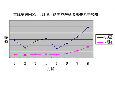 慧聰安防網(wǎng)08年1月~8月巡更類產(chǎn)品供求關(guān)系走勢(shì)圖