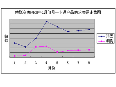 慧聰安防網(wǎng)08年1月~8月一卡通產(chǎn)品供求關(guān)系走勢(shì)圖