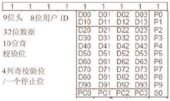 數(shù)據(jù)結(jié)構(gòu)如圖2所示,以連續(xù)9位“1”作為數(shù)據(jù)頭,是讀取數(shù)據(jù)時(shí)的同步標(biāo)識(shí);D00~D93位是用戶定義數(shù)據(jù)位;P0~P9是行奇偶校驗(yàn)位,PC0~PC3是列奇偶校驗(yàn)位,最后以“0”作為結(jié)束標(biāo)志,這種數(shù)據(jù)結(jié)構(gòu)有效的保證了數(shù)據(jù)傳輸?shù)恼_性。