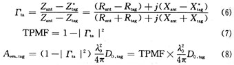 其中λ0=c/f本文天線設(shè)計主要針對阻抗做最大功率轉(zhuǎn)移匹配,由式(6)標(biāo)簽芯片與標(biāo)簽天線阻抗介面的反射系數(shù)(Γta),定義功率不匹配因數(shù)(Tag Power Mismatch Factor,TPMF)為式(7),當(dāng)阻抗為共軛匹配時,TPMF為1。