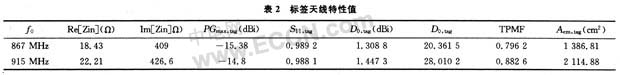 其中TPMF值預(yù)測了天線與芯片的阻抗匹配程度,而Aem,tag預(yù)測了天線有效接收面積。以PHILIPS公司的SL3S3001 FTT芯片的阻抗為參考,分析了上文設(shè)計的標(biāo)簽天線的特性,如表2所示。文獻(xiàn)[8]中設(shè)計的四種標(biāo)簽天線的有效面積最大達(dá)到900多cm2,而本文設(shè)計的天線在867 MHz和915 MHz處的有效面積在1 300 cm2以上,TPMF也達(dá)到0.8左右,可見天線性能均比較理想。