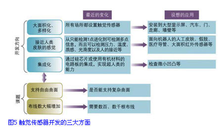 觸覺傳感器技術(shù)最近已真正開始實(shí)用化,而且具有非常高的性能。具體來說,業(yè)界正在進(jìn)行以下三大方面的新技術(shù)開發(fā)(見圖5):大面積化、使用場所及應(yīng)用的多樣化;目標(biāo)是具有人類皮膚的感覺,不僅檢測位置,還將檢測力度、壓力、溫度、表面凹凸、有無摩擦等;利用CMOS 工藝等進(jìn)行集成。