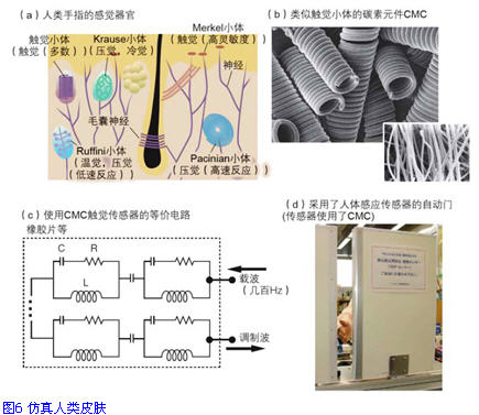 也有企業(yè)在開發(fā)類似人體感官的傳感器觸覺結(jié)構(gòu)。CMC技術(shù)開發(fā)公司就利用被稱為CMC 的線圈狀碳纖維制作了多款觸覺傳感器(見圖6)。所謂CMC就是將2 根直徑約1μm 的碳素纖維繞合成線圈狀,線圈直徑大約5μm~10μm,長度約300μm。