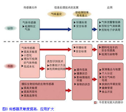 處于較領(lǐng)先地位的是聽覺傳感器與視覺傳感器,此類傳感器在信息處理、識(shí)別技術(shù)上的發(fā)展驚人。不久,應(yīng)該就可以從超高速動(dòng)態(tài)影像中提取出各種信息,并擴(kuò)大人類視野,可以看到以前人類看不到的地方。