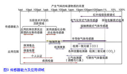 氣體傳感器有半導(dǎo)體式、電氣化學(xué)式、接觸燃燒式等多種類型(見圖9),各類傳感器可檢測的氣體濃度范圍及使用性各不相同。其中嗅覺傳感器大多采用了半導(dǎo)體氣體傳感器。