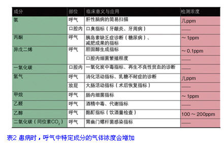 幽門桿菌是引起胃炎與胃潰瘍的主要原因。目前已有半導(dǎo)體氣體傳感器可以檢測CO2(二氧化碳)的濃度,從而判斷此病菌是否存在。而且此類氣體傳感器已經(jīng)應(yīng)用到設(shè)備上,在日本已認(rèn)定為醫(yī)療設(shè)備。在美國等國家也在進(jìn)行各種疾病與氣味關(guān)系的研究,并在討論是否適用于實(shí)際診斷(見表2)。