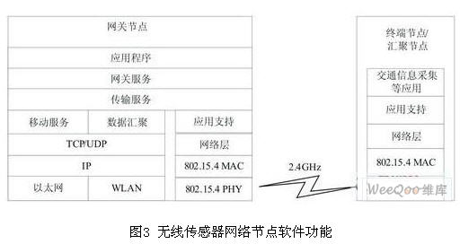 在ITS無線傳感器網(wǎng)絡(luò)的設(shè)計中,網(wǎng)絡(luò)節(jié)點按照功能不同,需要分別進(jìn)行設(shè)計。終端節(jié)點、匯聚節(jié)點和網(wǎng)關(guān)節(jié)點的軟件功能如圖3所示。終端節(jié)點安裝不同的傳感器用于運動車輛信息采集和道路信息獲取等。其功能實現(xiàn)可按照精簡功能設(shè)備(RFD,Reduced Function Device)標(biāo)準(zhǔn)來實現(xiàn)。終端節(jié)點與匯聚節(jié)點按照星型網(wǎng)絡(luò)組網(wǎng),在固定時間點由睡眠狀態(tài)醒來與匯聚節(jié)點主動通訊。信息路由則交給父(匯聚)節(jié)點及網(wǎng)絡(luò)中具有路由功能的協(xié)調(diào)器和路由器完成,降低了節(jié)點功耗和軟件實現(xiàn)復(fù)雜度。匯聚節(jié)點是終端節(jié)點軟件功能上的擴(kuò)展,實現(xiàn)了擴(kuò)展網(wǎng)絡(luò)及路由消息的功能,允許更多重點節(jié)點接入網(wǎng)絡(luò)。可按照全功能設(shè)備(FFD,F(xiàn)ull Function Device)標(biāo)準(zhǔn)進(jìn)行設(shè)計。