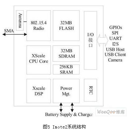 在設(shè)計無線傳感器網(wǎng)絡(luò)網(wǎng)關(guān)時,需要較強的數(shù)據(jù)處理能力,用以實現(xiàn)復(fù)雜路由協(xié)議以及信息處理等。如圖5所示Crossbow的imote2節(jié)點采用了Marvell PXA271 高性能、低功耗處理器。該處理器使用動態(tài)電壓調(diào)節(jié)技術(shù),頻率范圍13MHz~416MHz,可工作于低電壓(0.85V)低頻率(13MHz)模式,具備了優(yōu)良的動態(tài)電源管理技術(shù)。此外,該處理器封裝內(nèi)集成三個芯片256KB SRAM,32MB FLASH以及32MB SDRAM,減小了體積。通過提供多種I/O,能夠靈活的支持不同種類的傳感器。該處理器還支持一個MMX協(xié)處理器,提高多媒體處理能力,可以用于無線多媒體傳感器網(wǎng)絡(luò)中的語音和圖像處理。Imote2使用TI的CC2420 ZigBee射頻芯片,支持2.4GHZ 、16通道250kb/s數(shù)據(jù)傳輸,發(fā)送功率-24~0dBm。有效通訊距離是30米,可以通過SMA接口外接天線來增加傳輸距離。