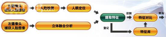 面對全球人臉識別的難題和困境,漢王科技歷盡七年的潛心研究,終于提出了全球獨創(chuàng)的“雙目立體人臉識別技術(shù)”,很好地解決了這一世界難題。漢王人臉識別系統(tǒng)采用專用雙攝像頭,就像一個人的兩個眼睛一樣,右側(cè)攝像頭的圖片進行人臉定位和眼睛定位,同時,左側(cè)攝像頭與右側(cè)攝像頭的圖片進行立體融合,恢復出三維人臉模型,在此基礎(chǔ)上,進行特征提取和比對,實現(xiàn)模板錄入和識別等功能。具體如下: