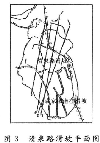 清泉路滑坡為袁家蹬潛在滑坡的組成部分(見圖3),位于袁家蹬潛在滑坡的前部,滑坡段北部位于長江左岸大溪溝右岸、東北部位于長江左岸河漫灘。清泉路滑坡外形似梨形,坐落在長江第一、二級階地上;袁家蹬潛在滑坡體(包括清泉路滑坡)形似腎形,坐落在長江第一至第三級階地上,西側(cè)與長堰塘滑坡相鄰。由于滑坡為大型松散堆積層滑坡,三峽水庫正常蓄水運行后,滑坡前緣大部分將被水淹沒,清泉路滑坡80%位于庫區(qū)水位變動帶,局部及整體失穩(wěn)的可能性大。從滑坡變形機制可以推斷清泉路滑坡為兩滑動的松散土體滑坡,具有兩級滑動面(見圖4)。滑坡預(yù)警的確定是監(jiān)測滑坡的重要內(nèi)容,也為治理滑坡提供了數(shù)據(jù)分析。