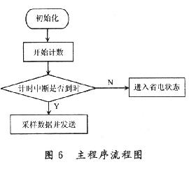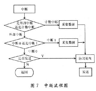按照硬件電路設(shè)計思路,軟件采用模塊化結(jié)構(gòu)程序設(shè)計方式。軟件模塊包括:系統(tǒng)初始化、數(shù)據(jù)發(fā)送模塊、接收中斷服務(wù)、突發(fā)中斷采集、A/D采集模塊、UART串口模塊。系統(tǒng)初始化基本思路:上電后設(shè)置串口方式3,開啟定時中斷和外部中斷,啟動接收模塊,進行通信檢測,進入省電模式。這里簡單給出主程序流程圖(見圖6),中斷流程圖(見圖7),圖7中中斷為接收中斷,中斷1為突發(fā)中斷。