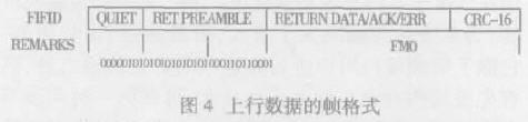 上行數(shù)據(jù)是指Tag 發(fā)送到Reader 的數(shù)據(jù)。上行數(shù)據(jù)幀的開頭都包含有休眠和返回包頭字節(jié)部分,與下行數(shù)據(jù)一樣,上行數(shù)據(jù)的頭部數(shù)據(jù)都采用NRZ 編碼,不同的是,上行數(shù)據(jù)幀的返回數(shù)據(jù)字和CRC- 16 校驗字均采用FM0 編碼,這種編碼即在比特時間邊緣均發(fā)生電平跳變,若每比特時間中間發(fā)生電平跳變則代表數(shù)據(jù)0,否則代表數(shù)據(jù)1。其數(shù)據(jù)的傳輸帶寬是NRZ 編碼的兩倍。返回數(shù)據(jù)的包頭字定義為32bits 二進制數(shù)據(jù):00 00 01 01 01 01 01 01 01 01 00 01 10 11 00 01。其幀格式如下圖。