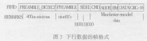 下行數(shù)據(jù)是指Tag 接收到的從Reader 發(fā)送過來的數(shù)據(jù)。在下行數(shù)據(jù)中,每幀的開頭都包含有包頭檢測(PREAMBLE_DETECT)、數(shù)據(jù)包頭(PREAMBLE)和開始標(biāo)識符(START DELIMITER) 三部分,它們均采用NRZ 編碼;數(shù)據(jù)幀包含其他數(shù)據(jù)如命令字、地址字和CRC- 16 校驗字均采用Manchester 編碼,其數(shù)據(jù)的傳輸帶寬是NRZ 編碼的兩倍。采用18%和100%兩種ASK 調(diào)制信號,波特率為8~40kBits/s。下行數(shù)據(jù)的包頭字為18bits 二進制數(shù)據(jù):01 01 01 01 01 01 01 0101,而開始標(biāo)識符在返回數(shù)據(jù)波特率為接收時的1 倍時,定義為11 00 11 10 10,為4 倍時定義為11 01 1100 10 1。數(shù)據(jù)的幀格式如下圖。