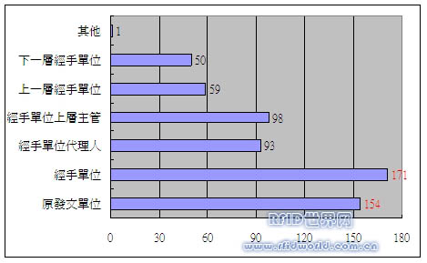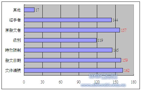 分析:由上圖可以得知,在訪問的問卷中,單位機(jī)構(gòu)的受訪者對于本計畫的RFID電子標(biāo)簽或管理系統(tǒng)所提供的儲存訊息可滿足多數(shù)人員的需求,其中以文件編號、發(fā)文日期及原發(fā)文者的訊息更為重要。另外在其他訊息部份也有一些對于本計畫電子標(biāo)簽或系統(tǒng)所儲存訊息的建議,如:公文類別、檔案名稱、對應(yīng)客戶資料、公文主旨、主管簽核批注、機(jī)密等級…等。