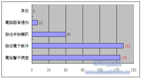 分析:由上圖可以得知,由于電腦化作業(yè)的普及,以電腦警示視窗和發(fā)送電子郵件通知的方式最為多數(shù)受訪者青睞。