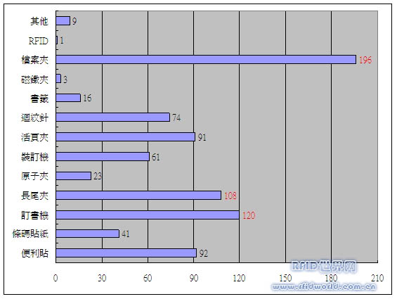 分析:由上圖可以得知,目前單位機(jī)構(gòu)使用最廣泛的文件管理工具為檔案夾,其次為訂書機(jī)及長尾夾為最多人使用。因此可以導(dǎo)入資源再利用的觀念,將電子標(biāo)籤結(jié)合於檔案夾及長尾夾上。