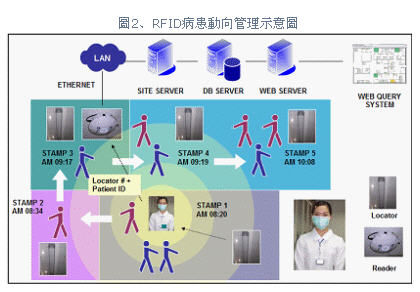 于病患身上采用RFID手環(huán),可用于門禁安全辨識(shí)管理與病患動(dòng)向管理,尤以失智或有傳染病疑慮的病患辨識(shí)與行蹤記錄管理(如圖2所示)。另外,亦可藉由RFID技術(shù)與遠(yuǎn)距醫(yī)療服務(wù)系統(tǒng)的整合,并配合3G無(wú)線通訊技術(shù)與生理訊號(hào)設(shè)備使用,使病患能夠于任何地點(diǎn),即時(shí)與醫(yī)療院所取得有效的溝通,大大提高緊急醫(yī)療服務(wù)的效率,節(jié)省等待的時(shí)間,爭(zhēng)取黃金救援時(shí)機(jī)。