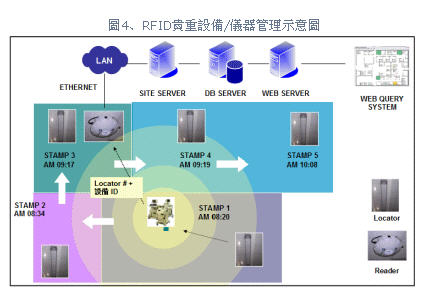 將RFID Tag貼附于貴重儀器財(cái)產(chǎn)上,可用來(lái)做盤點(diǎn)或者設(shè)備位置追蹤記錄,如此將可有效管理儀器設(shè)備位置,如遇異常亦可主動(dòng)警示或發(fā)報(bào),借以避免因遺失設(shè)備所造成的財(cái)產(chǎn)損失與風(fēng)險(xiǎn)(如圖4所示),一般是以采用讀取距離較遠(yuǎn)的主動(dòng)式Tag技術(shù)為主。