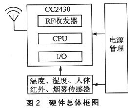 由于節(jié)點(diǎn)的數(shù)量較大,為了方便生產(chǎn),將FFD和RFD設(shè)備的主要區(qū)別放在軟件方面;而硬件部分除了協(xié)調(diào)器具有UART接口外,其他都是相同的。總體分為核心單元CC2430、傳感器模塊以及電源管理模塊3部分。硬件的總體框圖如圖2所示。