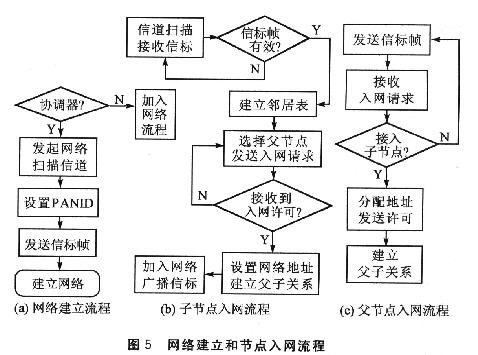 在網(wǎng)絡(luò)初始化過程中,協(xié)調(diào)器先將自身設(shè)置為一個(gè)簇標(biāo)識(shí)符為0的簇頭,并向臨近的設(shè)備以廣播方式發(fā)送信標(biāo)幀。接收到信標(biāo)幀的設(shè)備(路由器或終端設(shè)備)向簇頭請(qǐng)求加入網(wǎng)絡(luò),如果作為父節(jié)點(diǎn)的協(xié)調(diào)器允許該設(shè)備的加入,則將其作為子節(jié)點(diǎn)加入到它的鄰居表中,同時(shí),請(qǐng)求加入的設(shè)備將協(xié)調(diào)器作為父節(jié)點(diǎn)加入到鄰居表中,成為從設(shè)備。已經(jīng)加入網(wǎng)絡(luò)的路由器也廣播信標(biāo)幀,以這種方式,直到所有設(shè)備都接入網(wǎng)絡(luò)。在接入網(wǎng)絡(luò)的同時(shí),廣播信標(biāo)幀的父節(jié)點(diǎn)會(huì)向接人的子節(jié)點(diǎn)分配唯一的 16位網(wǎng)絡(luò)短地址。圖5是網(wǎng)絡(luò)建立和節(jié)點(diǎn)入網(wǎng)流程。