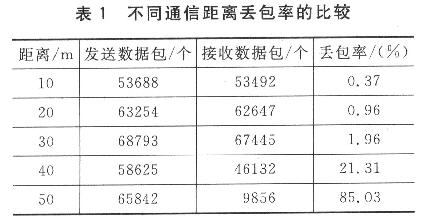通信距離測試:CC2430芯片工作電壓為3.3 V,射頻發(fā)送功率0 dBm,空曠地帶可靠傳輸距離30 m。功耗測試:CC2430射頻發(fā)射峰值功耗30 mA,接收峰值25 mA,休眠狀態(tài)0.1μA;為了保證實(shí)時(shí)監(jiān)控,傳感器得24小時(shí)工作,由此選擇了低功耗的傳感器。節(jié)點(diǎn)整機(jī)平均電流消耗17 mA。UPS功能測試:路由器接上220 V市電,正常入網(wǎng)后拔掉電源插頭,節(jié)點(diǎn)不掉電,不重啟;工作一段時(shí)間再插上電源,節(jié)點(diǎn)無死機(jī),不重啟,充電芯片給電池正常充電。表1為不同通信距離節(jié)點(diǎn)數(shù)據(jù)包丟包率比較。丟包率在2%以下時(shí),認(rèn)為數(shù)據(jù)可靠傳輸。