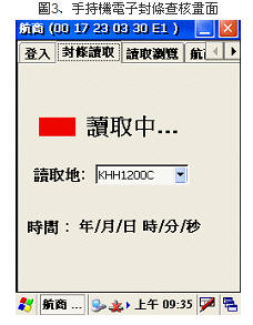 為了不增加使用者在手持機操作上的負擔或困擾,當要查核電子封條時,我們手持機系統(tǒng)操作,設計成在封條讀取的操作頁面上,只需按扣手持機手把上的板機,手持機就會去讀取電子封條,使用者即可由畫面的顯示判斷電子封條查核的結果(如圖3)。