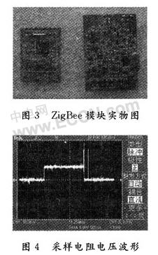 系統(tǒng)各種節(jié)點的硬件采用模塊化設計,ZigBee模塊實物如圖3中左邊所示,CC1100模塊如圖3中右邊所示。總體結(jié)構(gòu)緊湊合理、體積小。在晴朗天氣條件下的空曠地區(qū),測得ZigBee節(jié)點之間的有效通信距離可達120 m,433 MHz射頻模塊的有效傳輸距離可達400 m;工作在室內(nèi)條件下時,ZigBee無線信號可以穿透1堵混凝土墻,433 MHz射頻信號可以穿透4堵混凝土墻,有效地克服2.4 GHz射頻信號穿透性差的弱點。在ZigBee終端節(jié)點的電源電路中串聯(lián)接人1 Ω電阻,用示波器測得終端節(jié)點工作過程中,電阻兩端的電壓波形如圖4所示。