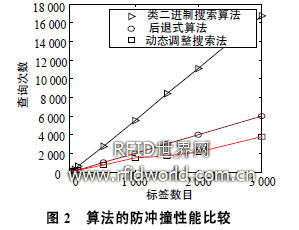 將動態(tài)調整搜索法與類二進制搜索法[2],后退式算法[3]在ISO/IEC 18000-6B協(xié)議[2]的應用中進行查詢次數(shù)的比較。為保持與協(xié)議規(guī)范一致,將使用協(xié)議相關功能指令GROUP_SELECT_EQ, READ/WRITE, DATA_READ [2] 分別取代第1.2節(jié)的指令Request, Read-Write, Quiet同時用FM0編碼[2]取代Manchester碼。假設標簽ID長度為16,用Matlab編程可得到仿真結果的比較如圖2所示。