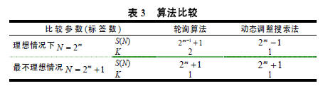 可知查詢次數(shù)S(N)只與碰撞位數(shù)L有關,而與標簽總數(shù)無關,吞吐率K不僅與碰撞位數(shù)有關還與標簽總數(shù)有關。特別地,令待識別的標簽卡號從0開始,與1.3節(jié)介紹的動態(tài)調整算法的比較如表3所示。