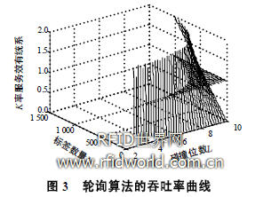 從圖3可看出,標簽數(shù)量較少,而碰撞位數(shù)卻很大時,吞吐率較低,此時不適合用輪詢算法。這種缺陷可稱為Hamming懸崖(Hamming cliffs),相鄰整數(shù)的二進制編碼可能具有較大的Hamming距離。例如2個標簽卡號分別為01111和10000,碰撞位數(shù)為5,要輪詢25-1+1=17次才讀完這兩標簽,可見效率很低。從圖3可看出只有標簽數(shù)量較大時,吞吐率K受碰撞位數(shù)影響不大,能克服Hamming懸崖,此時K基本介于1~2之間,效果比動態(tài)調整搜索法最優(yōu)吞吐率K=1要好。