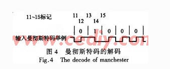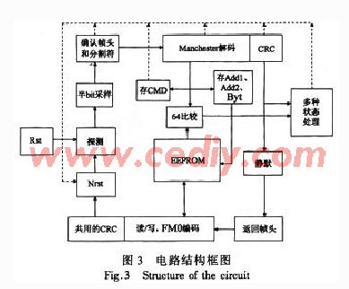 確認(rèn)幀頭和分割符:幀頭和分割符是固定值,根據(jù)C_halfbit點(diǎn)數(shù)設(shè)定電平變換范圍和次數(shù)。如果出錯(cuò),進(jìn)入Nrst,復(fù)位重新開(kāi)始下一命令。Manchester解碼:曼徹斯特碼以0到1二位表示傳輸值零(圖4中11~13),以1到0二位表示傳輸值1(圖4中13~15),其特點(diǎn)是一位碼中間(如12和14處)必有0與1的跳變。解碼時(shí)從跳變處開(kāi)始計(jì)數(shù),在C_halfbit值加5與2倍的C_halfbit加6之間,若是出現(xiàn)Din與上一個(gè)時(shí)鐘的Din不同,則說(shuō)明有變號(hào),也就是說(shuō)解碼成功,碼值為上一個(gè)Din的值。如圖4中13~14那一段,為1解出傳輸值1然后重新開(kāi)始記數(shù)解下一碼。若是記數(shù)超出上面的范圍,那么認(rèn)為解碼錯(cuò)誤,進(jìn)入Nrst。至于第1位碼,它前面是分割符,從分割符“1100111010’’的最后一個(gè)0起始處開(kāi)始解曼徹斯特碼即可。解碼的同時(shí)判斷Cmd、Add1(解碼時(shí)用)、Add2(編碼時(shí)用)、Byt等,并將相應(yīng)內(nèi)容存下來(lái),在需要與EEPROM比較時(shí)進(jìn)行實(shí)時(shí)比較。全部解碼值隨解碼的過(guò)程都送入CRC,到設(shè)定的判定條件進(jìn)行判斷,正確的話繼續(xù)進(jìn)行下一步,錯(cuò)誤則進(jìn)Nrst。