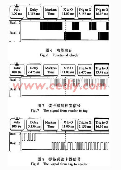 將代碼下載到FPGA板上輸入測(cè)試信號(hào),在邏輯分析儀中查看波形,如圖6,Bus1_0為輸入,Bus1_1為標(biāo)簽的返回信號(hào)。Bus1_1根據(jù)Busl_0不同而做出相應(yīng)不同的反應(yīng),并且能屏蔽返回值時(shí)可能有的Busl_0信號(hào),如第二、四幀不做處理(處理一、三幀中)。圖7與圖8為接受信號(hào)與返回信號(hào)的起始處放大圖。