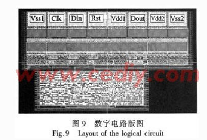 自動(dòng)布局線設(shè)計(jì)的版圖如圖9所示,有三個(gè)輸入,分別為Clk、Din、Rst,一個(gè)輸出為Dout。版圖通過(guò)了DRC(設(shè)計(jì)規(guī)則檢查)和LVS(版圖與電路圖一致比較),正在流片中。