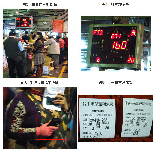 由果菜運(yùn)銷拍賣人員進(jìn)行拍賣,下標(biāo)人員可在拍賣區(qū)進(jìn)行貨品品質(zhì)查驗(yàn)。下標(biāo)人員經(jīng)由手上無線下標(biāo)機(jī)進(jìn)行下標(biāo),拍賣機(jī)系統(tǒng)列印拍賣清單。