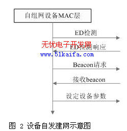無線傳感器網(wǎng)絡最初是由全功能設備(FFD)的節(jié)點發(fā)起并建立,無線傳感器網(wǎng)絡建立后,此發(fā)起設備就作為整個網(wǎng)絡協(xié)調(diào)器,該協(xié)調(diào)器可以通過串行接口和PC相連接,處理接收到的各種數(shù)據(jù),也可以和其他異種網(wǎng)絡進行數(shù)據(jù)交換。節(jié)點自發(fā)建網(wǎng)過程如下:FFD節(jié)點首先進行信道能量檢測(ED),選取檢測到的能量峰值最小的那個信道作為要建立的無線傳感器網(wǎng)絡的數(shù)據(jù)傳輸信道;然后在此信道上發(fā)送跨網(wǎng)信標(beacon)請求幀,用以獲取節(jié)點操作范圍內(nèi)其他無線傳感器網(wǎng)絡信息參數(shù),在接收到beacon幀后,選擇未被使用的網(wǎng)絡標號,最后根據(jù)已確定的網(wǎng)絡信道號、網(wǎng)絡標號及其他相關參數(shù)來設定硬件中相關寄存器的值,至此無線傳感網(wǎng)中網(wǎng)絡協(xié)調(diào)器就形成了。圖2是設備自發(fā)建網(wǎng)示意圖。
