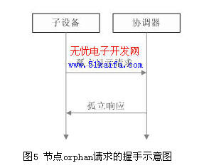 無線傳感器網(wǎng)絡除了節(jié)點有自組網(wǎng)能力外,還具有自愈和自節(jié)能的特點。當某一節(jié)點因為某種客觀環(huán)境原因或是原傳感網(wǎng)參數(shù)發(fā)生變化,導致此節(jié)點和傳感網(wǎng)脫離,脫離節(jié)點可以發(fā)送孤立(orphan)顯示請求幀給協(xié)調(diào)器,協(xié)調(diào)器在接收到請求幀后確定此節(jié)點是不是自己原先的孩子節(jié)點,在做出判定后向該節(jié)點發(fā)送響應幀,以確定是否重新接收該節(jié)點為自己的孩子節(jié)點。圖5 為orphan請求的握手示意圖。